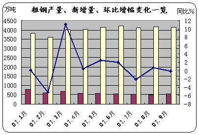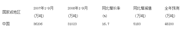 據(jù)國(guó)際鋼協(xié)統(tǒng)計(jì),9月份******67國(guó)粗鋼產(chǎn)量為1.101億噸,較去年同月增長(zhǎng)6.2%。2007年1-9月份,亞洲粗鋼產(chǎn)量為5.408億噸,較去年同期增長(zhǎng)11.7%。9月份,中國(guó)粗鋼產(chǎn)量為4153萬(wàn)噸,較去年同月增長(zhǎng)14.8%。